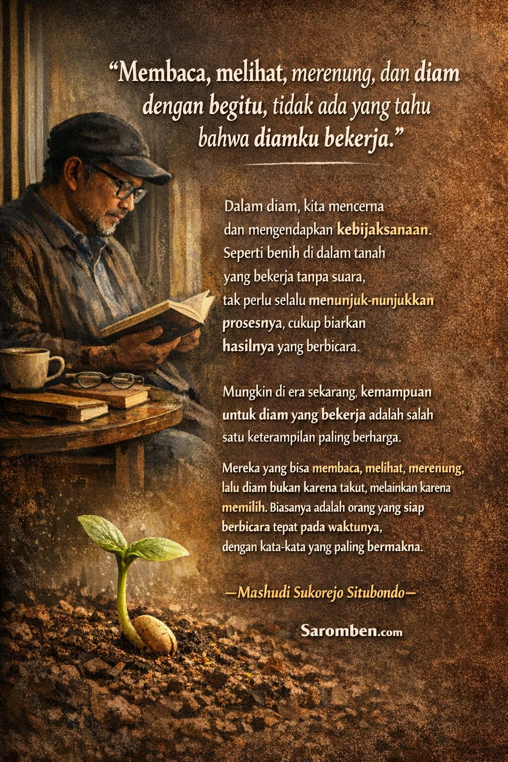 Seperti biji yang ditanam di dalam tanah, proses pertumbuhan tidak disertai sorak-sorai. Ia gelap, sunyi, dan tidak terlihat. Namun justru di situlah kehidupan sedang bekerja paling intens. Begitu pula manusia. Tidak semua proses perlu dipamerkan. Tidak semua langkah harus diumumkan. Ada fase di mana bekerja dalam senyap jauh lebih produktif daripada berbicara tanpa kedalaman.