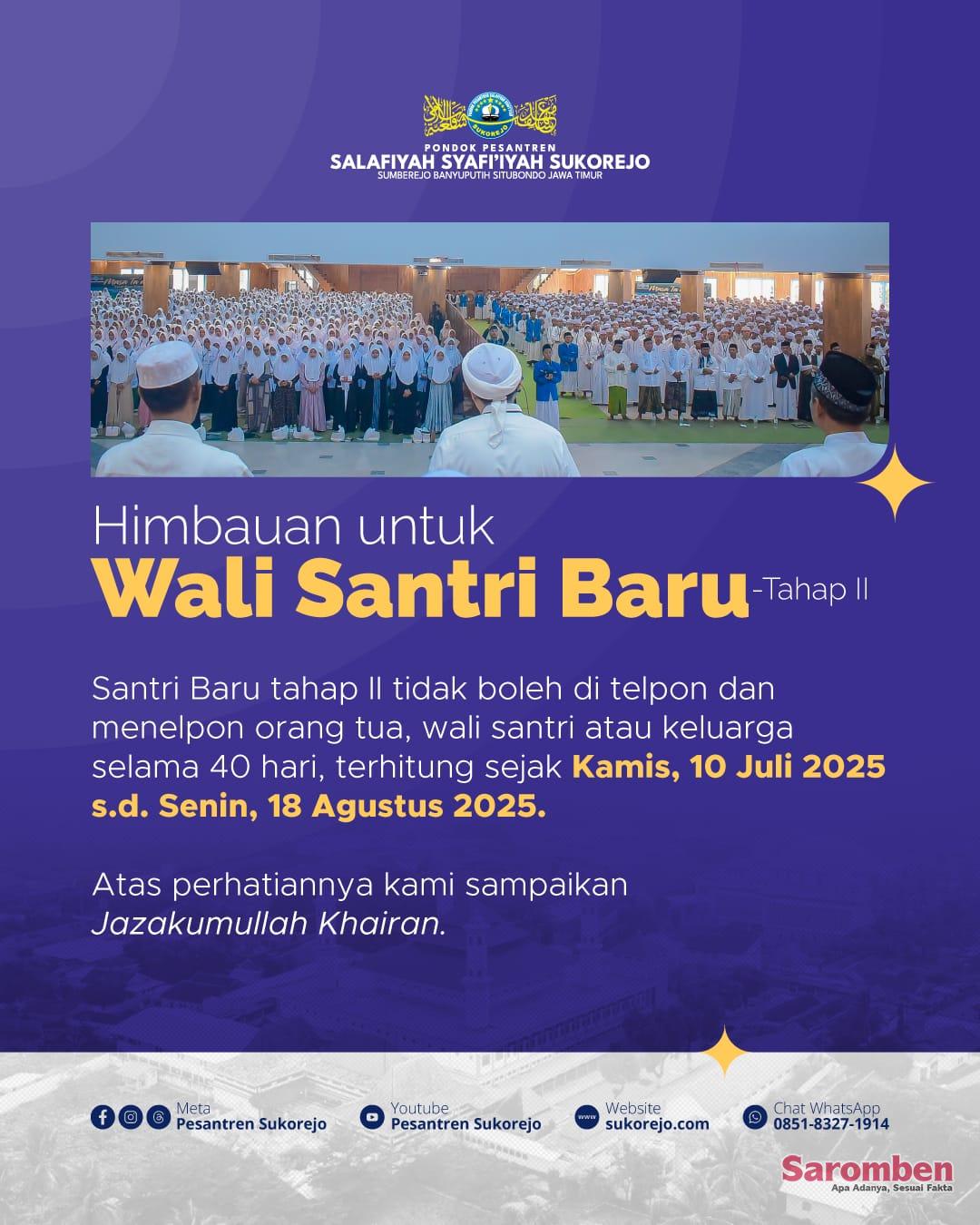 Situbondo –Pondok Pesantren Salafiyah Syafi’iyah Sukorejo, Sumberrejo, Banyuputih, Situbondo, mengeluarkan himbauan penting kepada para wali santri baru tahap II tahun ajaran ini. Dalam himbauan resmi yang diterbitkan oleh pihak pesantren, disampaikan bahwa santri baru tahap II tidak diperkenankan melakukan komunikasi melalui telepon dengan orang tua, wali santri, atau keluarga selama 40 hari.