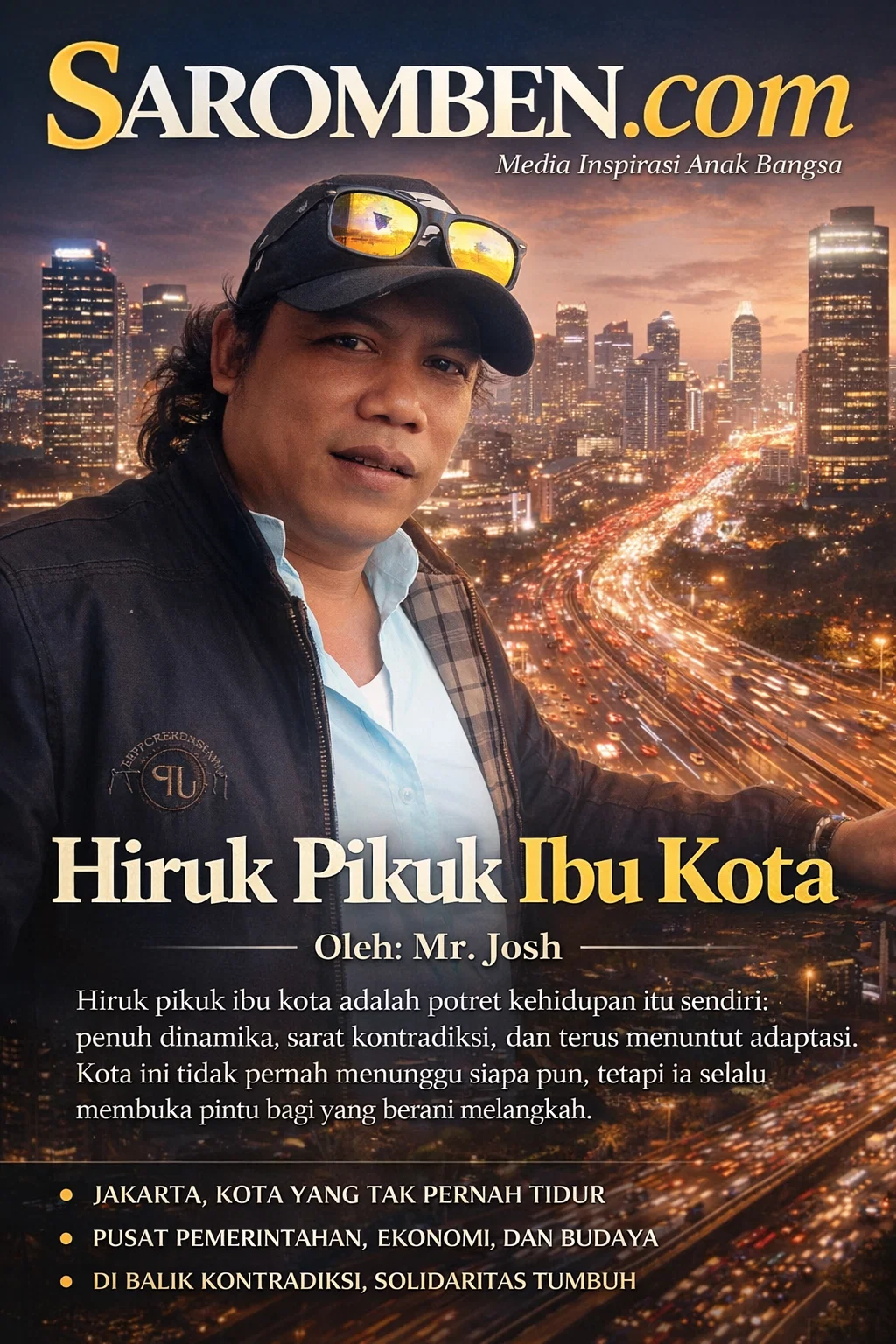 Sebagai pusat pemerintahan, ekonomi, dan budaya, Jakarta menyatukan berbagai wajah Indonesia dalam satu panggung raksasa. Dari pagi yang dibuka dengan kemacetan hingga malam yang ditutup oleh lampu-lampu neon, denyut kota bergetar tanpa jeda. Di sinilah mimpi-mimpi besar ditanam sebagian tumbuh subur, sebagian lain layu oleh kerasnya persaingan. Namun, justru di situlah letak pesona ibu kota: ia jujur pada konsekuensi, adil pada kerja keras, dan tegas pada ketidak-siapan.