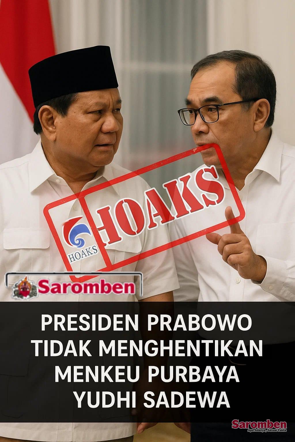 Klaim bahwa Presiden Prabowo menghentikan Menkeu Purbaya Yudhi Sadewa adalah berita bohong alias hoaks.