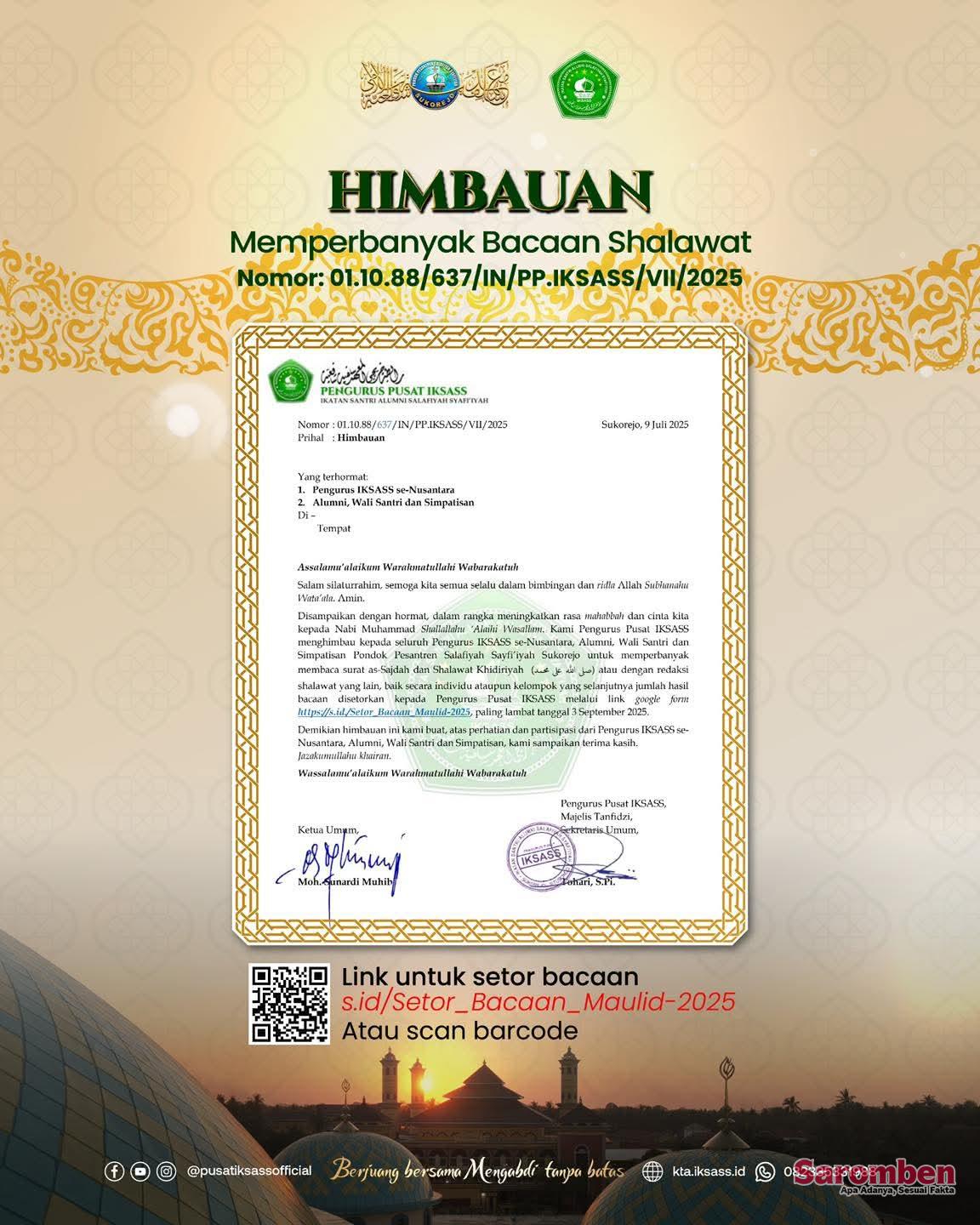 Himbauan ini tertuang dalam surat resmi bernomor 01.10.88/637/IN/PP.IKSASS/VII/2025 yang ditandatangani oleh Ketua Umum Pusat IKSASS, Moh Sunardi Muhib. Ia menekankan pentingnya memperkuat ikatan spiritual melalui bacaan shalawat seperti Shalawat ‘Alaiki Wasalam, Shalawat Kifayah, dan Shalawat Khidriyah.