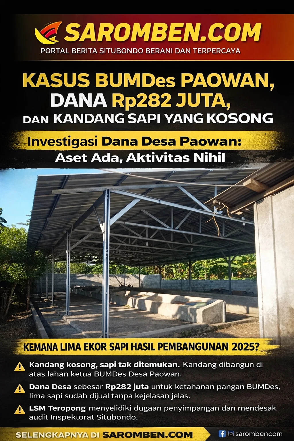 Situbondo – Pagi itu, kandang sapi milik BUMDes Desa Paowan berdiri dalam diam. Tidak ada lenguhan ternak, tidak ada aktivitas perawatan, hanya struktur bangunan yang tampak baru namun kosong dari fungsi utamanya. Bagi tim LSM Teropong yang datang melakukan investigasi lapangan, pemandangan tersebut bukan sekadar kejanggalan melainkan titik awal dari rangkaian pertanyaan serius mengenai penggunaan dana desa senilai Rp282 juta.