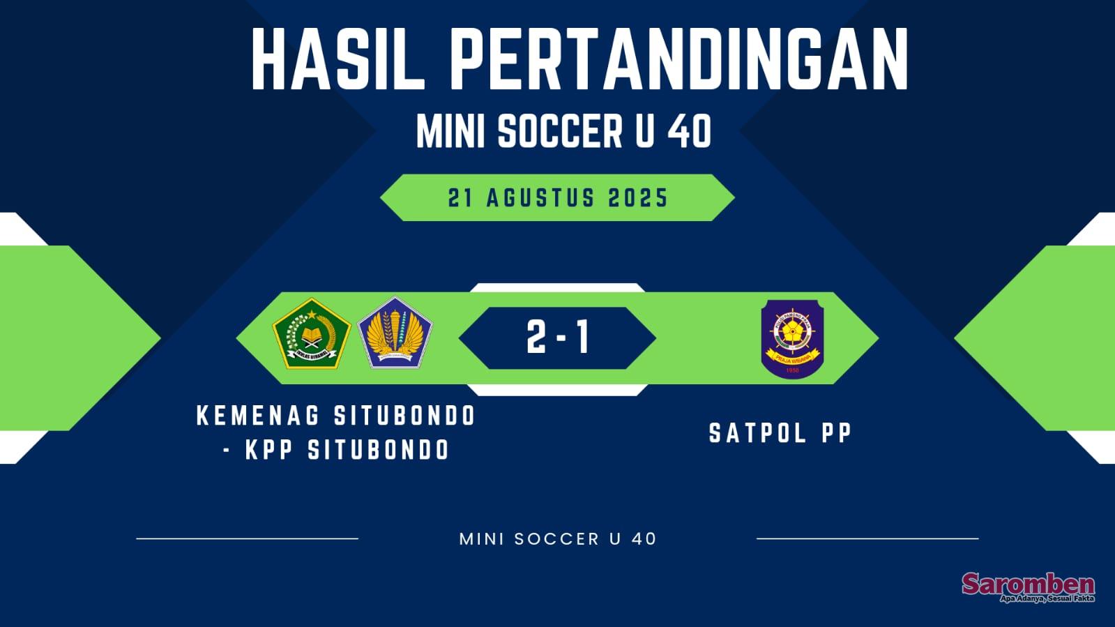 Bertanding di Lapangan Mini Soccer, Kamis (21/8/2025), Kemenag–KPP Situbondo sukses menundukkan Satpol PP Situbondo dengan skor tipis 2-1. Pertandingan berlangsung sengit sejak menit awal, kedua tim tampil penuh semangat untuk mengamankan poin penting di laga pembuka.