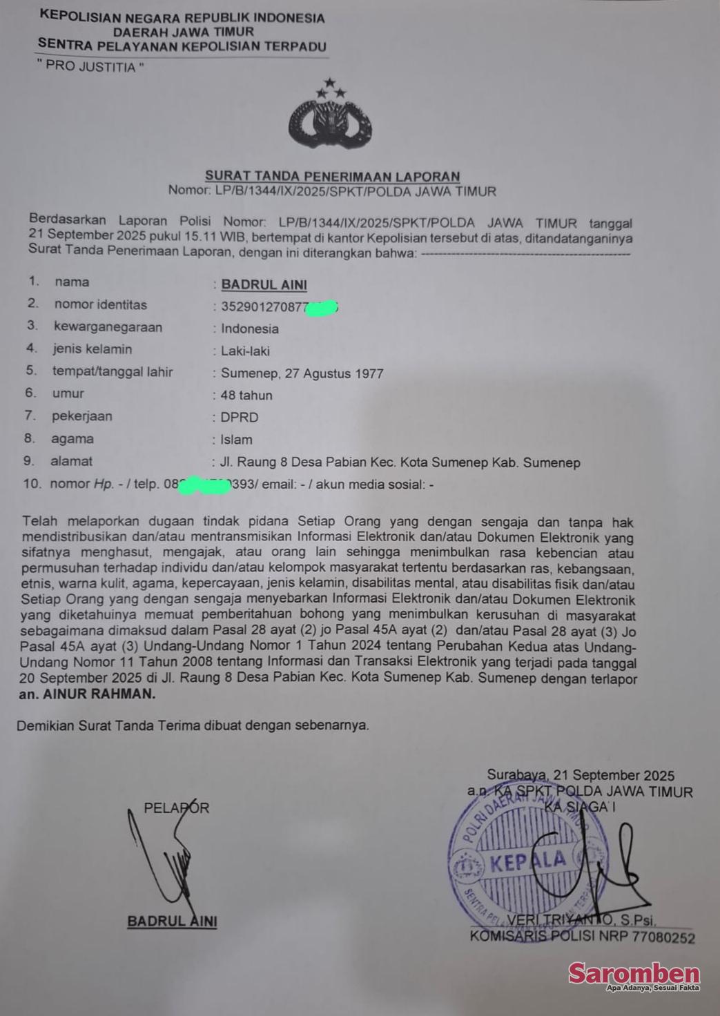 SURABAYA – Ketua Garda Satu Jawa Timur, Badrul Aini, secara resmi melaporkan akun Facebook bernama Regal Jal-Jol yang diketahui beridentitas asli Ainur Rahman, warga Desa Sambakati dan berdomisili di Desa Daandung, Kangayan, ke Polda Jawa Timur pada Minggu (21/9/2025).