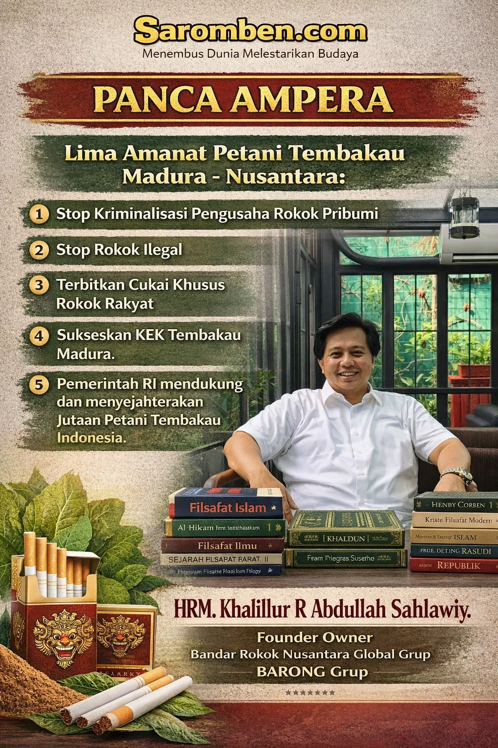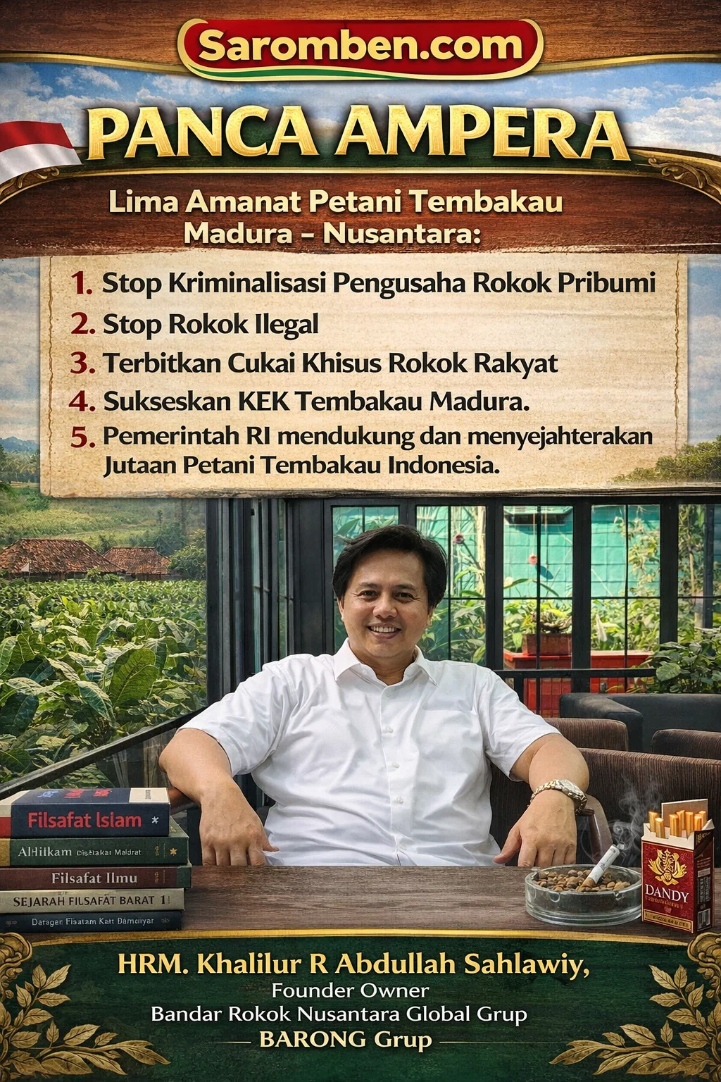 Dari titik inilah HRM Khalilur R. Abdullah Sahlawiy Gus Lilur, pemilik Bandar Rokok Nusantara Global Grup (BARONG Grup) melontarkan sebuah dokumen gagasan yang tidak sekadar deklaratif, melainkan sarat muatan struktural: PANCA AMPERA (Lima Amanat Petani Tembakau Madura–Nusantara).