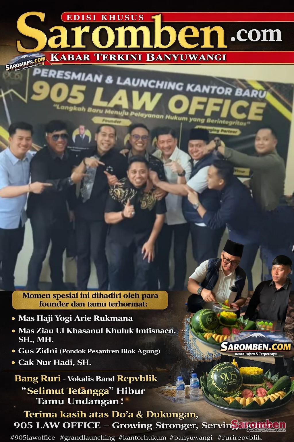 BANYUWANGI – Dengan penuh rasa syukur dan optimisme, 905 Law Office secara resmi menggelar peresmian kantor barunya di Banyuwangi. Momentum ini bukan sekadar seremoni pembukaan ruang kerja, melainkan penegasan arah dan komitmen sebuah firma hukum yang terus bertumbuh menjadikan profesionalisme, integritas, dan pelayanan publik sebagai fondasi utama dalam setiap langkahnya.