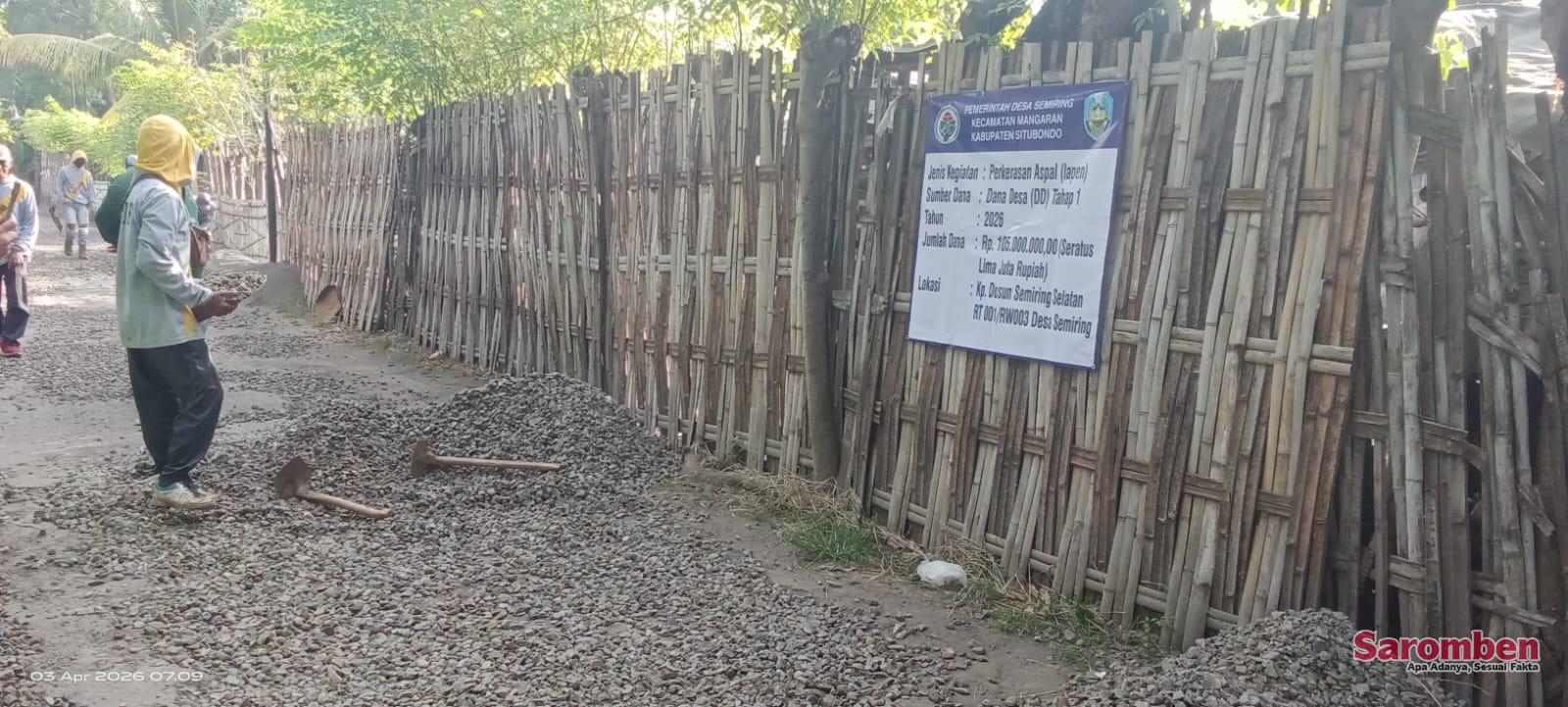 Situbondo – Proyek pembangunan lapisan penetrasi (lapen) yang bersumber dari Dana Desa (DD) tahun anggaran 2026 di Desa Semiring, Kecamatan Mangaran, Kabupaten Situbondo, kini menjadi sorotan publik. Proyek dengan nilai anggaran sebesar Rp105 juta tersebut diduga tidak dikerjakan sesuai dengan Rencana Anggaran Biaya (RAB) serta spesifikasi teknis (spektek) yang telah ditetapkan sebelumnya.
