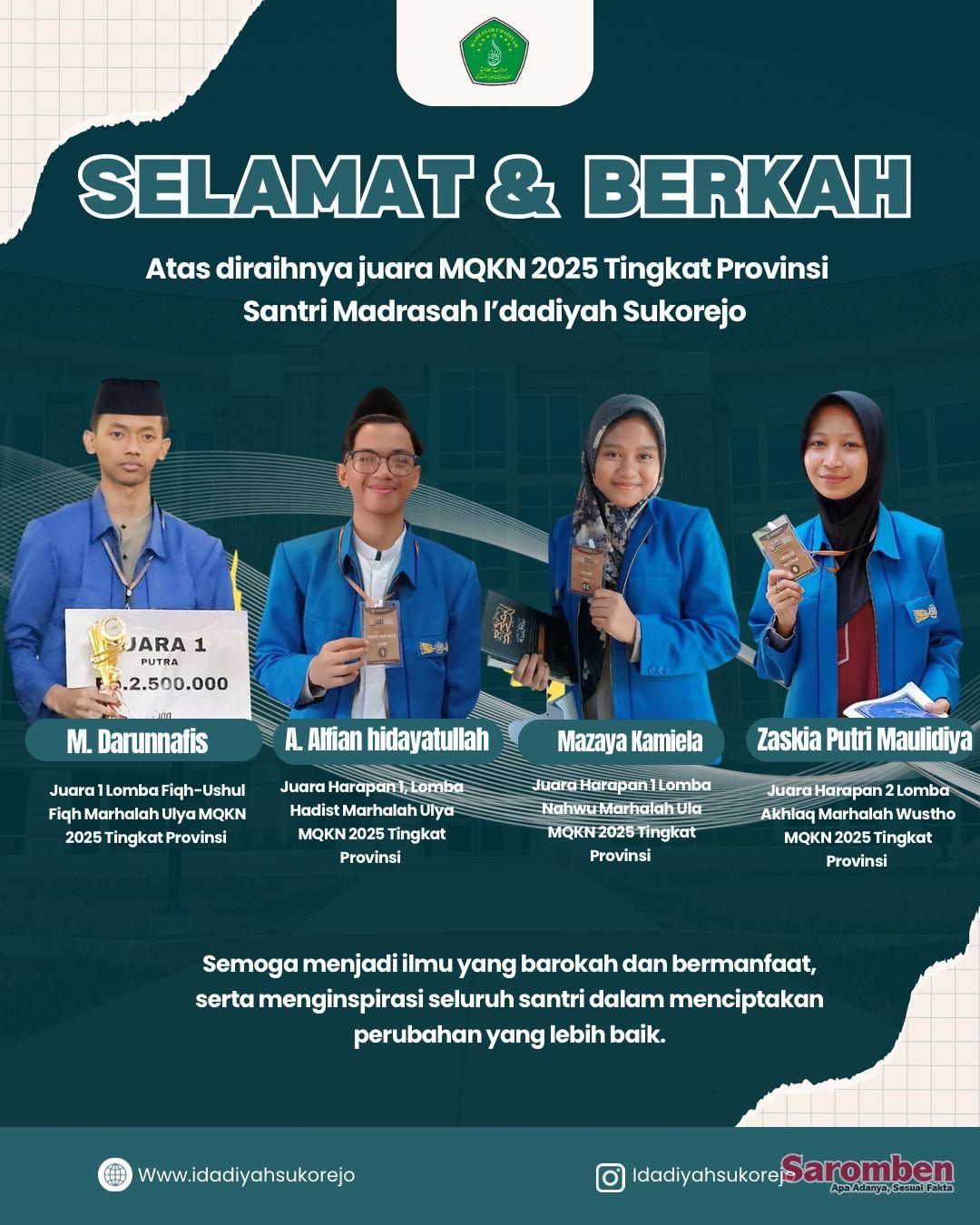 Prestasi gemilang kembali menghiasi perjalanan pendidikan santri Madrasah I’dadiyah Sukorejo. Dalam ajang bergengsi Musabaqah Qira’atil Kutub Nasional (MQKN) 2025 tingkat Provinsi Jawa Timur, empat santri berhasil mengharumkan nama lembaga dengan memborong gelar juara di berbagai cabang lomba keilmuan Islam.