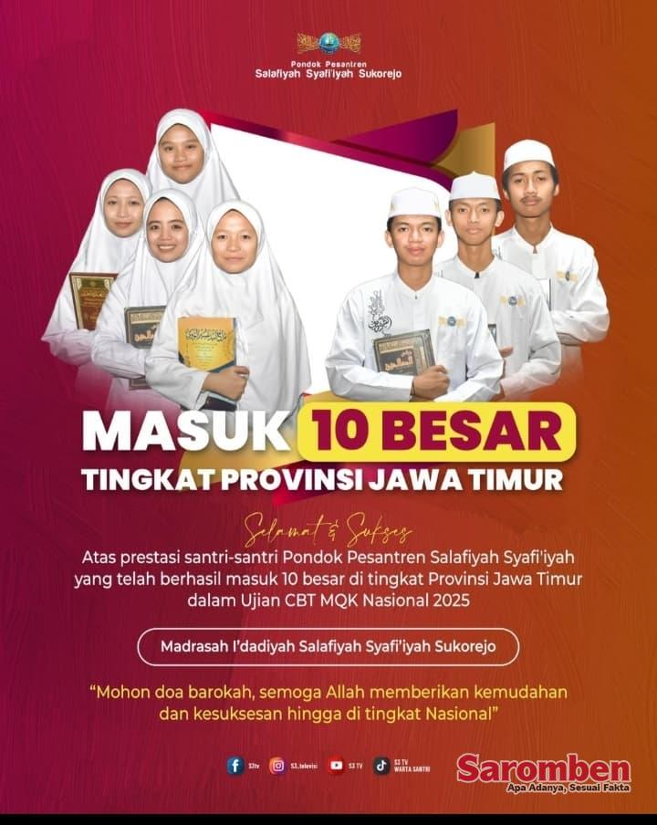 Prestasi membanggakan kembali ditorehkan oleh para santri Pondok Pesantren Salafiyah Syafi’iyah Sukorejo. Dalam ajang Ujian CBT Musabaqah Qiraatil Kutub (MQK) Nasional 2025 tingkat Provinsi Jawa Timur, para santri sukses menembus 10 besar terbaik, sebuah pencapaian luar biasa yang menunjukkan kualitas keilmuan pesantren legendaris asal Situbondo ini.