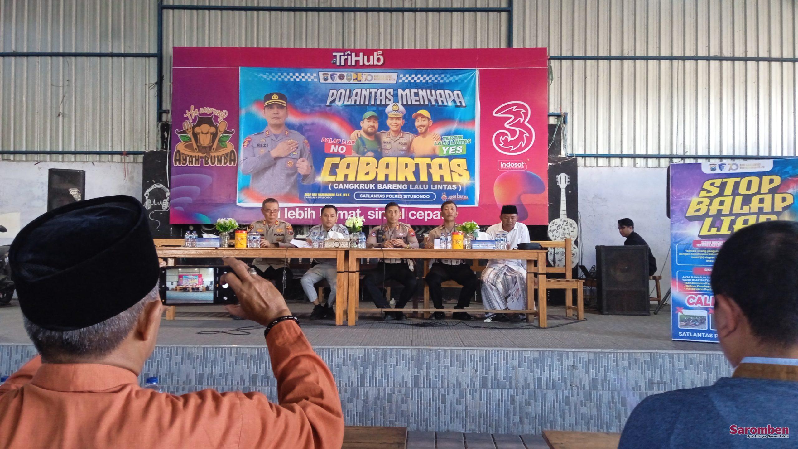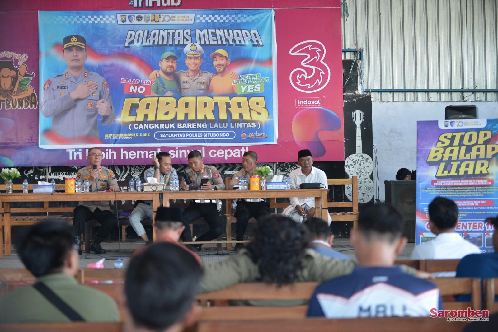 Situbondo – Satuan Lalu Lintas (Satlantas) Polres Situbondo kembali melaksanakan program Cangkruk Bareng Lalu Lintas (CABARTAS) di Cafe Ayah Bunda sebagai upaya membangun kesadaran tertib lalu lintas di kalangan masyarakat (19/9/2025).