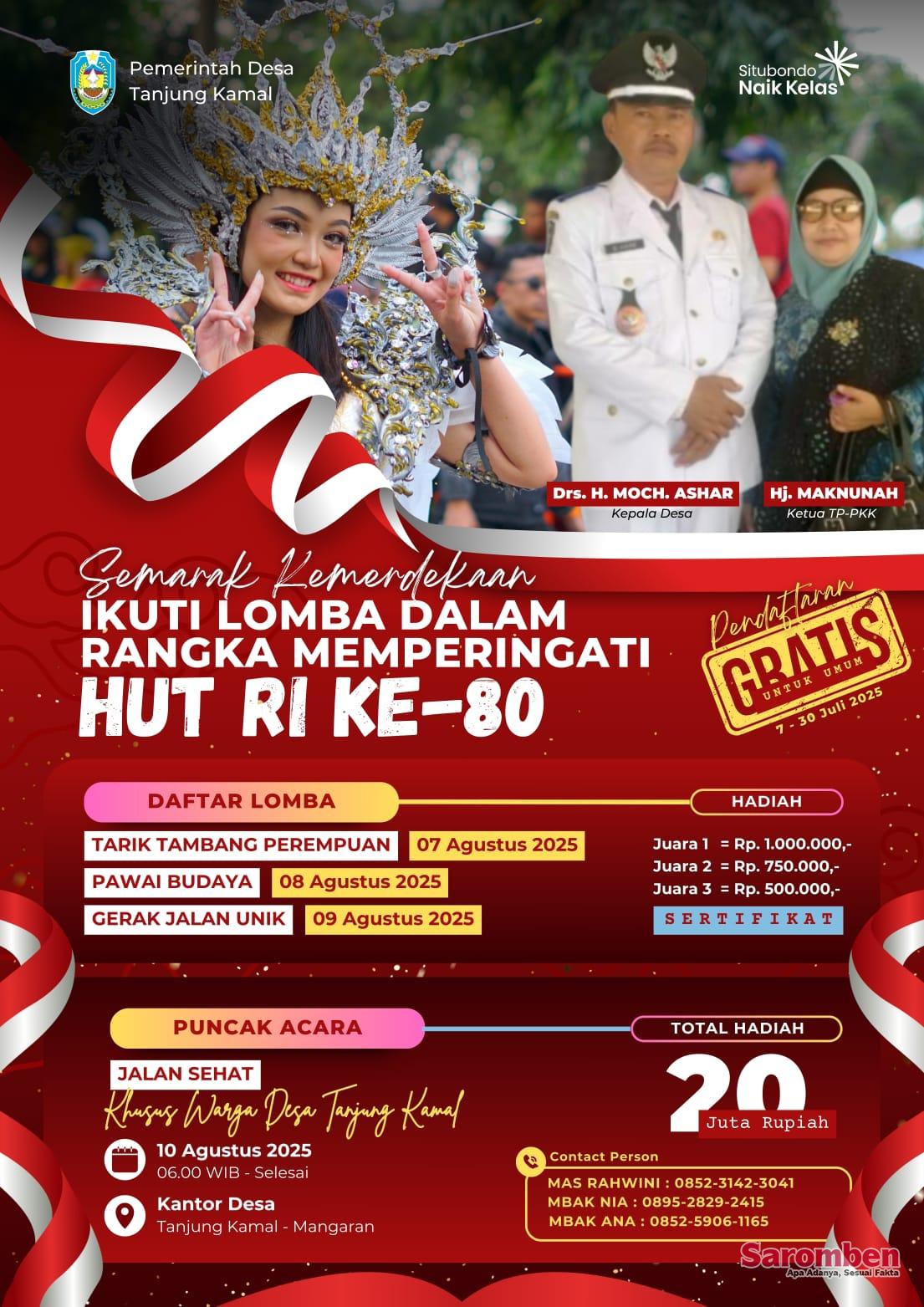 Situbondo – Dalam rangka memperingati Hari Ulang Tahun ke-80 Republik Indonesia, Pemerintah Desa Tanjung Kamal, Kecamatan Mangaran, Kabupaten Situbondo, menggelar serangkaian kegiatan meriah bertajuk “Semarak Kemerdekaan”. Kegiatan ini terbuka untuk umum dan pendaftaran peserta tidak dipungut biaya, berlangsung mulai tanggal 7 hingga 10 Agustus 2025.