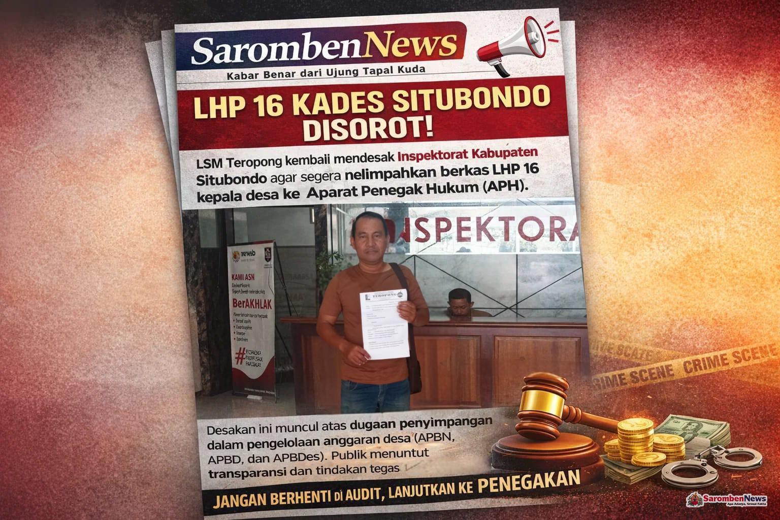 Situbondo – Tekanan terhadap Inspektorat Kabupaten di Situbondo kian memuncak. Untuk kedua kalinya, aktivis LSM Teropong secara terbuka mendesak agar berkas Laporan Hasil Pemeriksaan (LHP) terhadap 16 kepala desa segera dilimpahkan kepada Aparat Penegak Hukum (APH). Desakan ini bukan sekadar pengulangan, melainkan sinyal meningkatnya ketidakpuasan publik atas lambannya tindak lanjut hasil audit yang dinilai krusial.