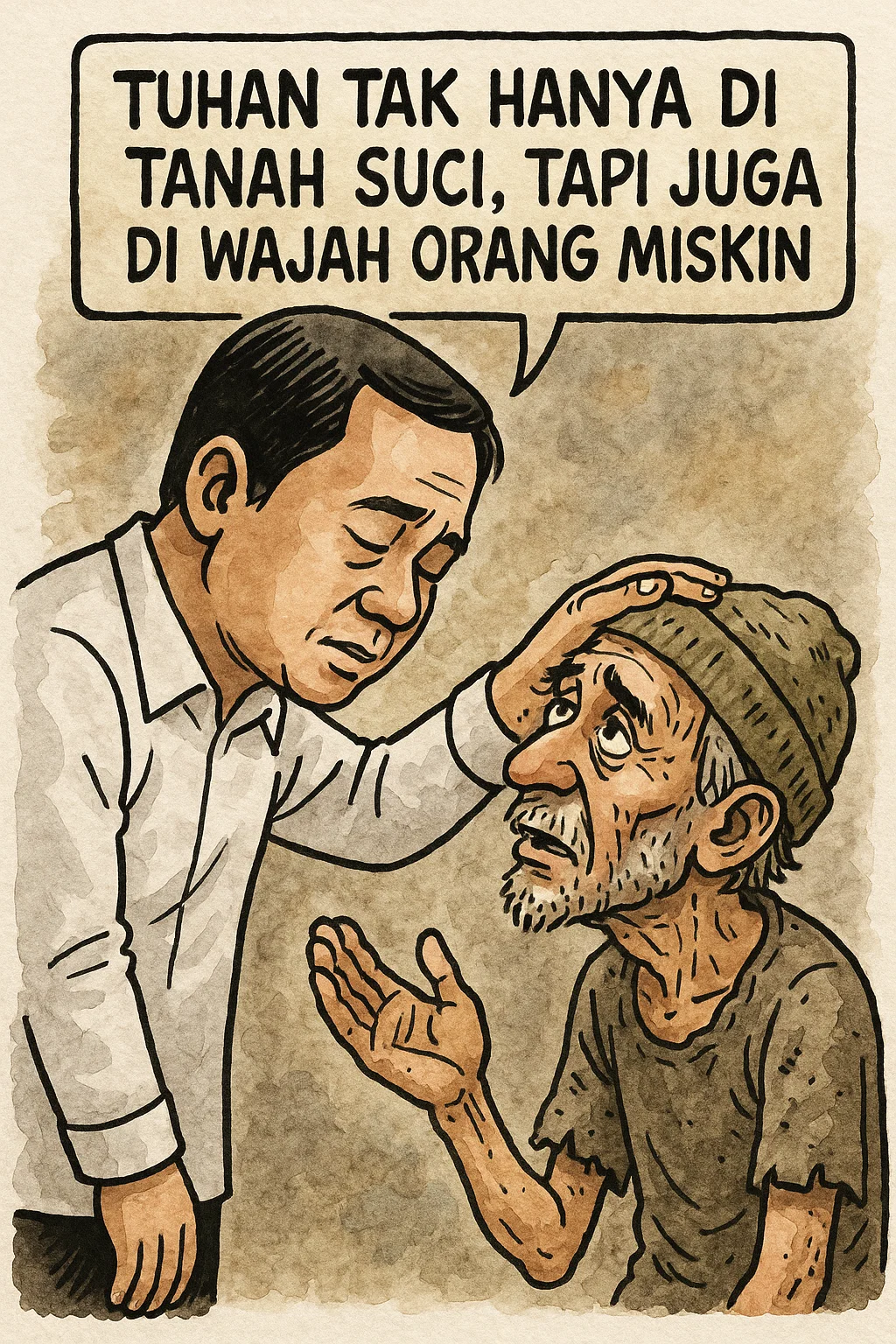 Ibadah tidak salah, tetapi ketika ritual lebih dipentingkan daripada kepedulian sosial, maknanya menjadi timpang. Apakah Tuhan hanya hadir di Makkah dan Madinah? Bukankah Ia juga ada dalam air mata anak yatim yang terancam putus sekolah, dalam perut kosong yang menahan lapar, dan dalam suara orang miskin yang menjerit minta tolong?