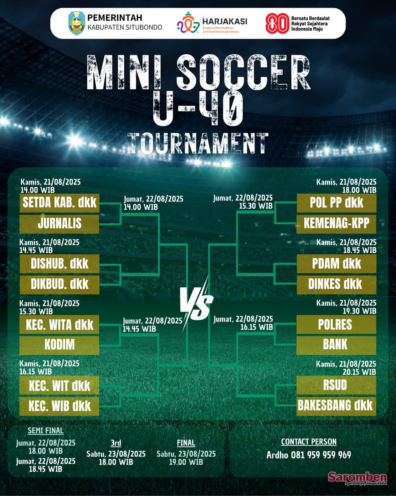Situbondo – Pemerintah Kabupaten Situbondo menggelar Turnamen Mini Soccer U-40 dalam rangka memeriahkan Hari Jadi Kabupaten Situbondo (Harjakasi) ke-207. Ajang bergengsi ini berlangsung mulai Kamis (21/8/2025) hingga Sabtu (23/8/2025) di Lapangan Mini Soccer, Situbondo.