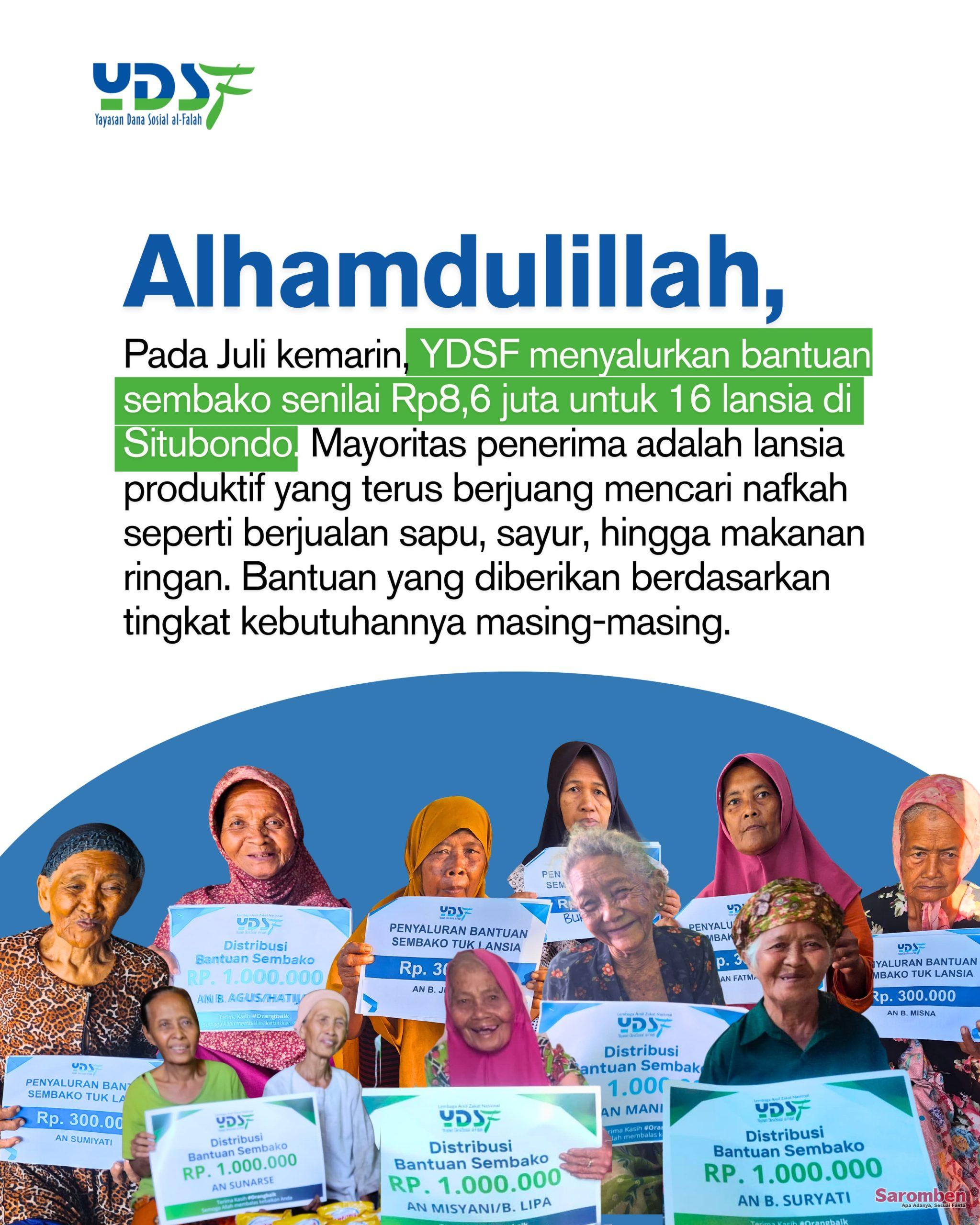 Situbondo, Juli 2025- Yayasan Dana Sosial al-Falah (YDSF) kembali menegaskan komitmennya dalam membantu masyarakat kurang mampu. Pada bulan Juli ini, YDSF menyalurkan bantuan sembako senilai total Rp8,6 juta kepada 16 lansia dhuafa di wilayah Situbondo.